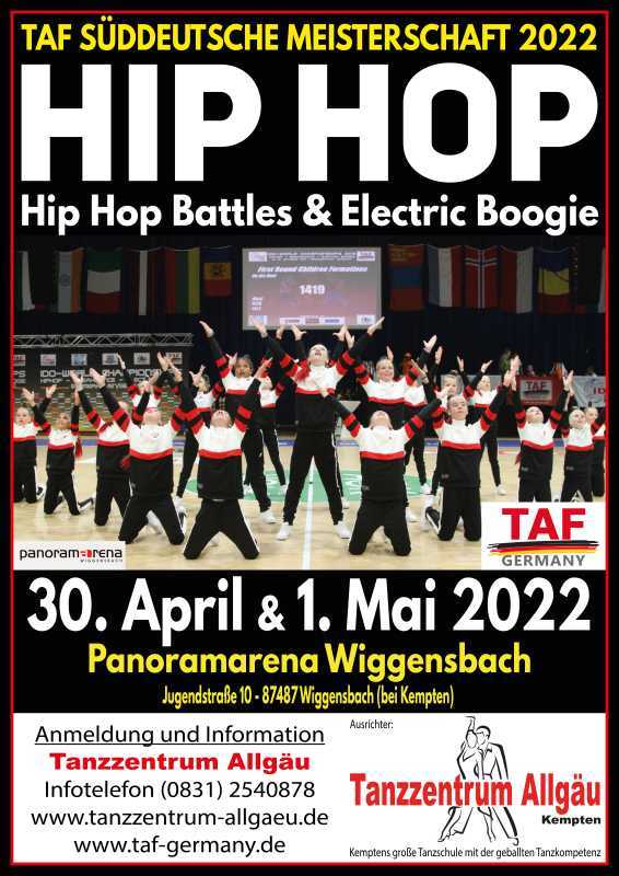 Am Samstag, den 30. April 2022 und am Sonntag, den 1. Mai 2022 fand in der Panoramarena Wiggensbach die TAF Süddeutsche Meisterschaft HipHop, HipHop Battles & Electric Boogie 2022 statt.